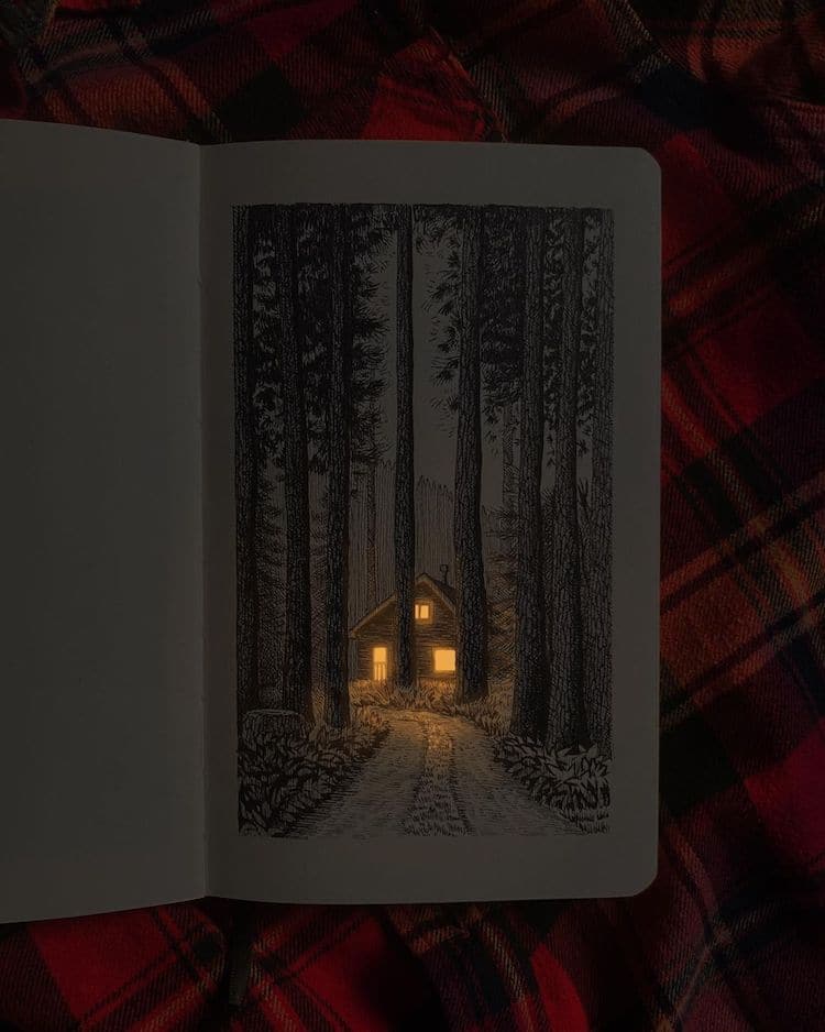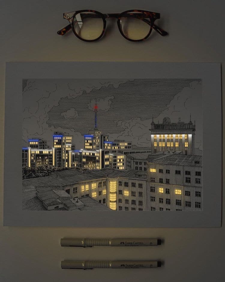 Would like to try this technique. First, draw pen and ink on paper. Take a photo in dim light. Add lights digitally to bring the image to life.