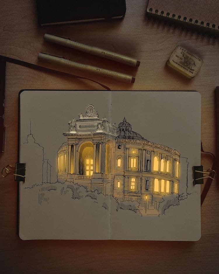 Would like to try this technique. First, draw pen and ink on paper. Take a photo in dim light. Add lights digitally to bring the image to life.