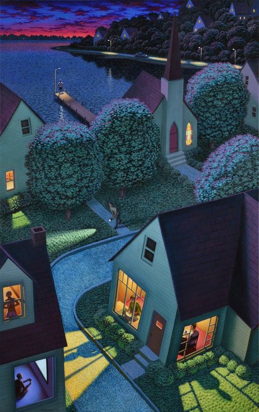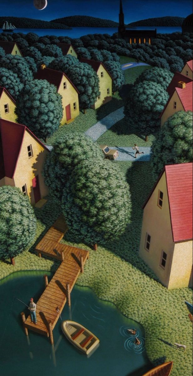 These suburbs are like a distant memory. Sort of familiar, sort of surreal, tainted with warm or cool light. Many of the paintings are done by Kathleen Eaton. Some are modified by AI and some sources are unknown.